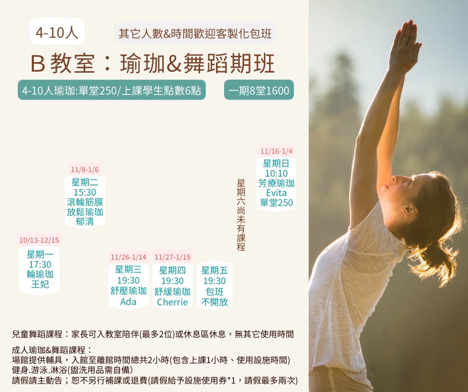 瑜珈課:請勿遲到超過10分鐘,課程著運動服裝