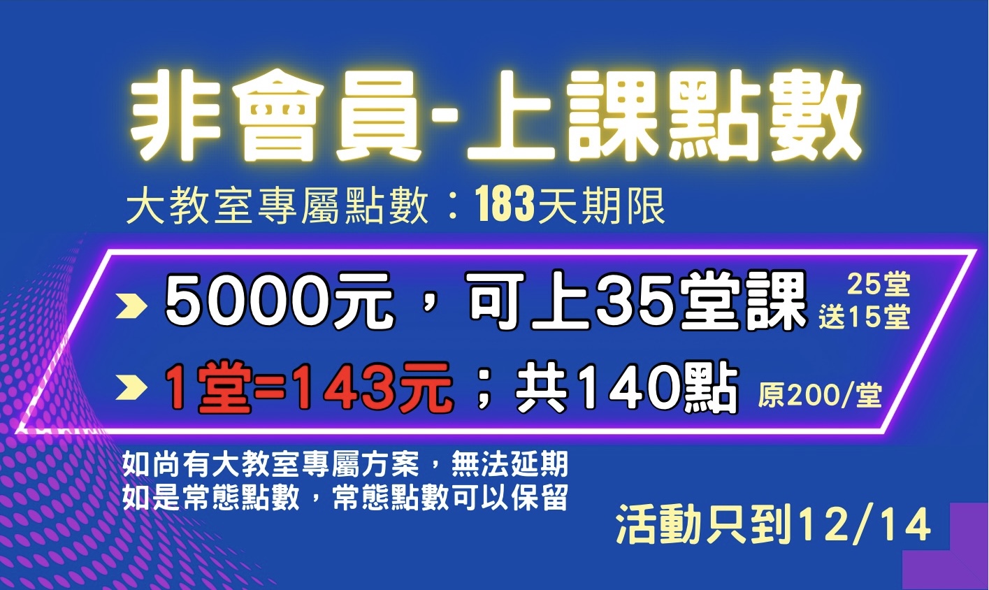 大教室課程:購買5000方案,每堂142元 (原價200)